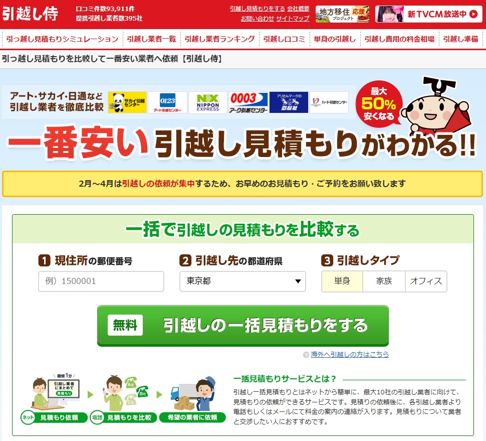 引越し侍は、全国300社以上の引越し業者から無料で一括見積もりが取れるサービスです。