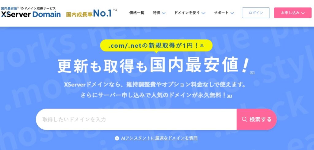 | 価格が安い | .com が年間1,000円台〜取得可能 |
